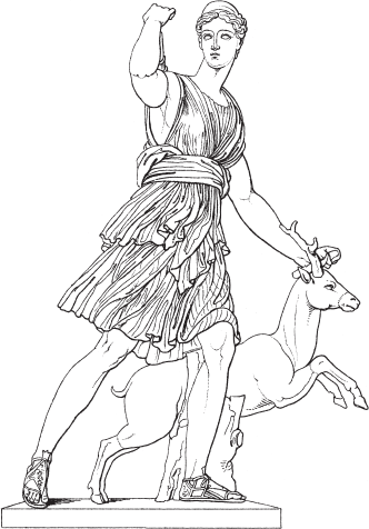 Артемида (у римлян – Диана) – одна из древнейших богинь Греции. Как можно предположить, Артемида – богиня-охотница – первоначально была покровительницей животных, как домашних, так и диких. Сама Артемида в древнейшее время изображалась иногда в виде животного, например медведицы. Так изображалась Артемида Брауронская в Аттике, недалеко от Афин. Затем Артемида становится богиней – охранительницей матери во время рождения ребенка, дающей благополучные роды. Как сестра Аполлона, бога света, она считалась также богиней луны и отождествлялась с богиней Селеной. Культ Артемиды – один из распространенных в Греции. Знаменит был ее храм в городе Эфесе (Артемида Эфесская).