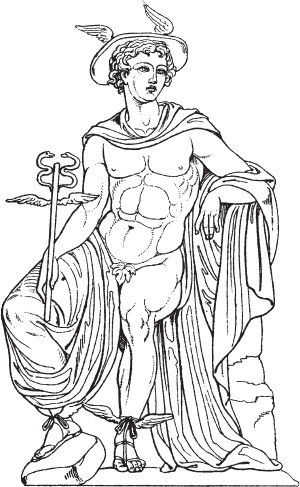 [Закрыть], бог Гермес, посланник богов. С быстротой мысли переносится он с Олимпа на самый дальний край света в своих крылатых сандалиях, с жезлом-кадуцеем в руках. Гермес охраняет пути, и в Древней Греции у дорог, на перекрестках, у входов в дома стояли посвященные ему гермы[40]40