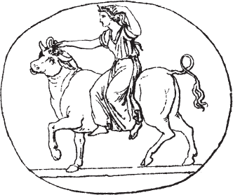 Трепеща от страха, сидит на спине быка Европа. Одной рукой она держится за его золотые рога, другой же подбирает край своего пурпурного платья, чтобы не замочили его морские волны. Напрасно боится она: море ласково шумит и не долетают до нее его соленые брызги. Морской ветер колышет кудри Европы и развевает ее легкое покрывало. Все дальше берег, вот уже скрылся он в голубой дали. Кругом лишь море да синее небо. Скоро показались в морской дали берега Крита. Быстро приплыл к нему со своей драгоценной ношей Зевс-бык и вышел на берег.