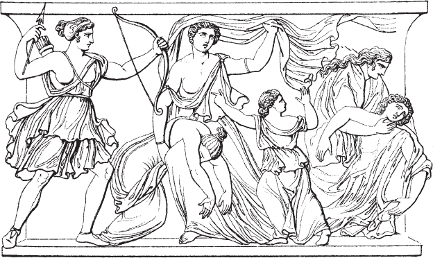 Услыхала богиня Латона надменные речи Ниобы. Она призвала детей своих, Аполлона и Артемиду, и, сетуя на Ниобу, сказала: