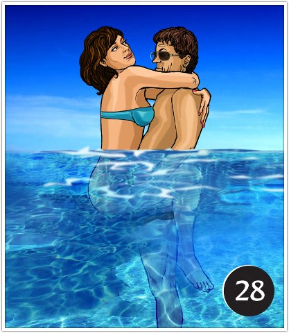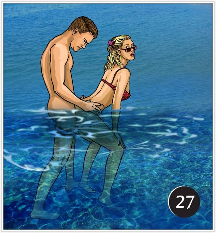 Если вы зайдете в воду глубже, то эту и следующую позы можно практиковать почти незаметно для окружающих, при условии, что никто не ныряет поблизости, и вы занимаетесь сексом не очень страстно. Ну обнимается парочка в воде, и что такого, сплошь и рядом такое можно увидеть.