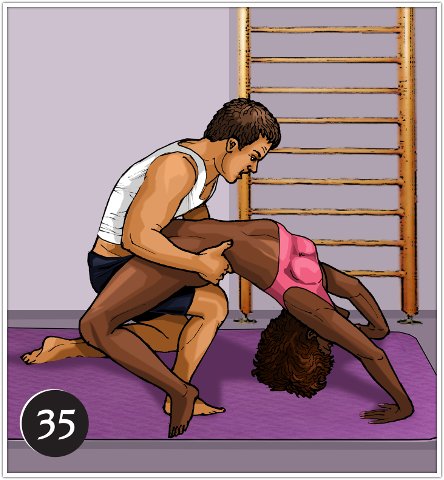 Для устойчивости практиковать эту позу лучше на полу, подложив под женщину мягкий коврик. Обхватив шею партнера ногами и опираясь на локти, она сможет легко удерживать равновесие. Мужчина не давит на партнершу сверху, а наоборот, приподнимает, придерживая ее руками за бедра. Тогда положение будет устойчивым, но в любом случае долго в нем не задерживайтесь.