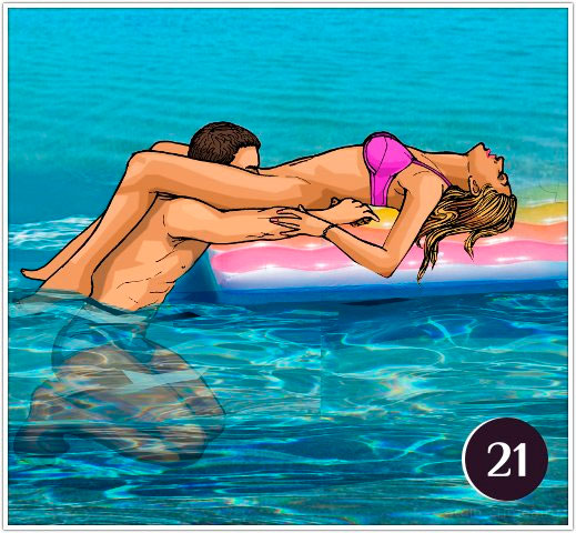Удерживая вес ног женщины на своих плечах, мужчина оставляет на плаву ближнюю к себе часть матраса так, чтобы промежность партнерши не погрузилась под воду, и ему не пришлось ее глотать.