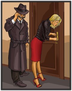 Персонажи на этом рисунке специально одеты, ведь он иллюстрирует ролевую игру «Бдительный охранник» из Сборника «Тайны замочной скважины». В ней, застукав любовников за сексом в офисе, охранник шантажирует их угрозой увольнения и в результате присоединяется третьим.