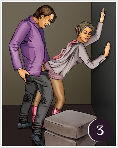 Возможен и такой вариант взрыва страсти, когда женщина прижата к стене. У мужчины за счет этого не сильно напряжена спина, и вся нагрузка приходится, в основном, на руки и ноги. Само собой, что женщина должна быть не очень тяжелой, а мужчина – достаточно силен, тогда взрыв эмоций вам гарантирован. Глубоко насаживая партнершу на член, мужчина почувствует себя поймавшим добычу хищником.