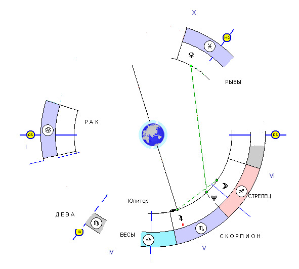 Следующая схема определения «Плодотворности». Важно I дом и Асц находится в водном Раке, управительницей которых считается Луна. Она сама в полуплодотворном. Венера в плодотворных водных Рыбах, обозреваема и Нептуном, и Юпитером. Важно и положение самого Юпитера также во всегда плодотворном водном Скорпионе. Важно и положение 5-го дома «Детей, плодов» начинающихся в плодотворных Весах.