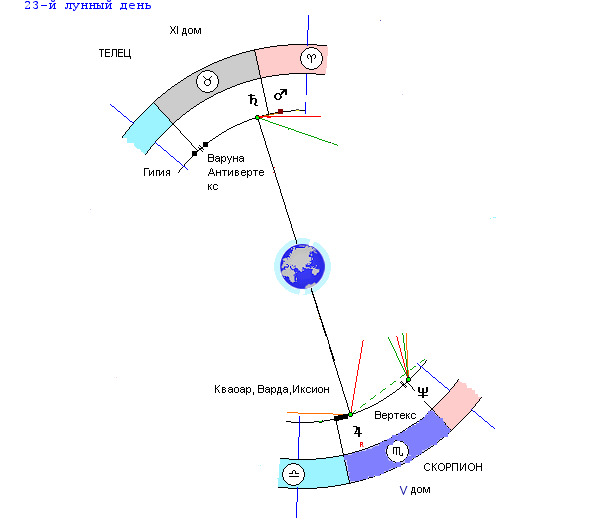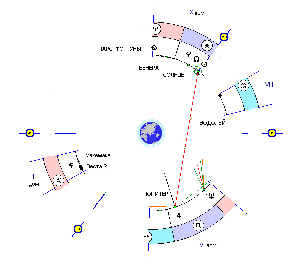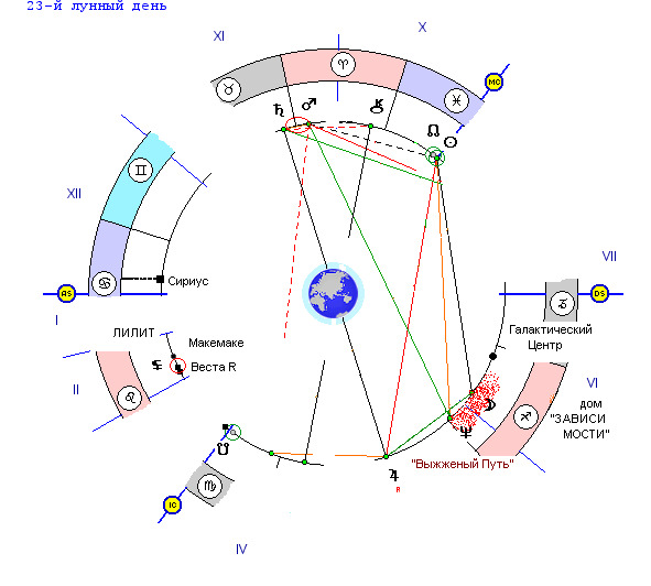 Но мы не договорили о Скорпионе, который тайна и весь затоплён в самую сердцевину 5-го дома. Один выдумыватель астрологический велит считать середину дома куспидом, но в том-то и смысл затопления знака всего, чтобы нивелировать его от этого, чтобы нейтрализовать действие в подвешенном состоянии таковым образом от доминирования. Значит у меня в том скорпионском может быть неопознанное и невзнузданное действие, которое из меня, мне же может быть неожиданным. Вот же интересный самый большой дом делится, помимо управляющих Весов еще и на подвешенный полный знак, и на часть Стрельца с Нептуном. Это очень важно чтобы Гороскоп разбирал сам знающий себя обладатель сего, который и лучше всё учтёт, и почувствует на голову лучше всего того, что говорят маститые клиентам своим. В начале Скорпиона три заметных Плутоноида со спутником в половину. Подобное наблюдается до ретро-Юпитера. Еще в этом знаке градус «Золотого сечения» – 13, но это кажется выдуманный тем же фантазёром, а также некий плохой градус 19, всеми признанный за таковой. В самом же завершении Вертекс. Весьма насыщенная Энерго-картина!