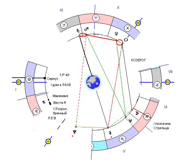 При первом же взгляде на свой гороскоп в интуиции человека срабатывает отражение действительности в Отношении тех лично расположенных тайных символов о тебе, на которые ты был привнесен. А оставлять каждого человека наедине с этим Учением очень опрометчиво, так как в разрыв сей, как видно из практики Жизни ринулась куча магов и чародейцев использовать потребности в верных Знаниях, своим толмаченьем без основ широкого Знания о человеке не могущих применять то, но всё равно по мелкому угадыванию и общерастекаемым фразам в сферах не могущих не быть за каждым человеком приземляющих и отводящих в прельщении своих чародейств души людей на себя. Только сам человек, никто как лучше всего знающий себя может понимать что-то значит то, или иное стояние знаков в собственном исполнении, а всякие технические особенности можно подчерпнуть из справочного материала с нужным подставлением своего известного. Фишки-астро… лежат безлико и что на них будет наложено зависит только от Души, качеств её, достижений, промахов. Звёздная карта указывает на общую Энергетическую ритмику внутренних токов, каковые все не только на знаках, но и даже внешнем виде человека считается отображаются. И вот первый показатель того свойства: Рак на Асценденте (восхода Солнца), как раз перечит общепринятым характеристикам знатоков, как о маленьких, толстеньких живчиках, но наоборот по родовой предрасположенности ставит ростом выше среднего и с приличествующим замедленным движением тела и души во внешних проявлениях. Стремительная мысль работает как бы отдельно и не забирает вслед за собой действование. Но не эти особенности, которые могут лишь удовлетворять праздному любопытству, а вот то именно, что действительно могло бы заинтересовать, собирающихся связать свою дальнейшую судьбу и кого непременно свяжут дальнейшие события, есть одно первостепенноважное место в знаке Рака, а именно точка проекции звезды Сириус. И если бы линия Асцендента в гористой местности над долиной поймы, в которой распологается большой город рождения – Красноярск была на звезде или рядом, то это бы именно тогда и не говорило о столь наизамечательнейшем факте, одним из самых таинственных, связанных с самой загадочной звездой всей Небесной карты, потому что если смотреть от берега большой реки по кубокилометражу выброса вод в океан, спорящей кажется за первое или одно из первых мест в мире, но надёжно забранная телами мощнейших гидроэлектростанций, как раз во время рождения одной из них забиравшейся, так вот с востока край Земли значительно поднимала платформа, резко обрывавшаяся как склон крутой горы вниз. Это сильно изменяло данные показателя от географически выводимых компьютерной программой 17—40 в приближение к тем самым 13° 40 Сириуса того времени. Было ли именно так, но всё ныне указывает на крайнюю приближенность к такому замечательному факту, по сравнению с которым даже Солнце в Зените и Северным Лунным узлом – второе дополнение в благоприятном трине 120 градусов взаимодействия всему тому таинственному, что связано со звездой «Гения Рождения» на Восходе и по личности монаршей с родившейся тем самым и Монархией, в тот ли самый миг ЗенитаСолнца (38-я секунда) – СириусГоризонт, хоть пусть как бы не изводились от этих нескромно сказанных преждевременно перед ними все бесящиеся 