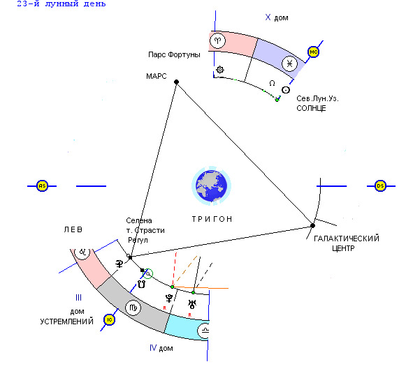 В Третьем доме Устремлений тот же самый Лев, да еще и с Селеной – яркой стороной Луны в перигелии сближения, куда направлен был потенциал того движения энергетической карты, вызывающий самые прекрасные определения по поводу предоставляющихся силовых возможностей использовать нажитое наследие от несения света в прошлом. Здесь же проявленный королевский Регул, как указывающий на саму область устремления и пик Страсти, с тем уже вдвойне подчеркивающей неслучайность всего с этим связанного. Из всего треугольника тригона вышел самый чистоэнергетический угол на звезду. И опять управитель знака в 10 доме, котором сойдутся смыслы многих домов, не только этих двух, что являет из себя крайнюю обострённую необходимость в государственности, которой так не хватает всему.