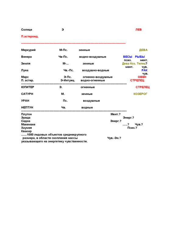 Мы имеем еще отличную характеристику «радости», но оная у нас сразу отправляется по опыту понимания в тоже самое, что и управитель в обители в пребывание над домами. Если конечно это не та экзальтация планет в знаках, но в любом случае слитая в понимании. Найдя формулу соответствий, опираясь на опыт начувствований эпохальных, всё можно будет пораспределять и нужно сразу себе уявить сколько же при настоящем субъективизме может быть несогласящихся, что даже и сам внутри получишь отторжение к выведенному. Субъективизм знаете ли, это и наприлегавшаяся мыслями приятность, кою следовать будет разорвать. Хотя и теоретическое понимание домов, как троичностей с тяжёлыми ли преобладаниями знаков, или наоборот сильными в свободе, но вот у домов была приведена версия о куспидах, как мощных энергетических центрах, что без самой Энергетики не обошлось и в астрологическом субъективизме двигания всем и вся и должно являться также «тяжелым» в нашем разумении высказывания. Тем более, что Солнце участвует в домообразовании не менее, чем Земля. И здесь уже можно бы было разобраться в половинах по 12 из каких-то тяжелых и лёгких действительно, тем более что в лёгкой витающей части на каждое состояние приходится ровно по три знака стихии. А на примере домообразования мы уже угадывали функцию от себя и всё далее, шире, выше, с выходом вообще вовне в 12 доме. Это значит уже можно проставлять шаги в составе удаляющихся субстанций, навроде если в составе Т. – Э. – Г. и Т. – Г. – Э. ушла далее, то и дом, но и знак стали следующими. Можно задать подобную задачу электронному высчиту машины, но прежде необходимо применить тот опыт эпох. Мы к тому же имеем чуть ли не эталонные связки: Солнца – Лев; Сатурн в самой что ни на есть по свойству влияния и смысла понятий Козерога, как «козлища» стримающего. Солнце – самый чистый эталон энергии-огня точно относится ко Льву, как обители на однородности энергии созвездия. Газовый же гигант-менталист в «Козле» со скотом в стаде казалось бы, но с бараном оказались разными. У барана похоже значительный элемент земной из трех огненных, как то Стрелец – воздушный, а Лев – Классический энергик. Где чувственное? Остался в домах, которые тяжелее? Необходима разборка знаков. Может быть и Лев не чистая Энергия, но тогда Чувственность? Имеем ввиду и продолжаем рассматривать земные, а именно уже указываемого чувственным на втором по крайней мере месте Тельцом. Классическую трактовку ретельности и… имеет Дева …Менталистка. А Козерогу выходит быть психиком на втором месте у себя, как земного знака. А Сатурн это Пс. – Мент. У него даже-то и кольца из твёрдого вещества с ожерельем крупных спутников. Да и металлизация водорода в теле гигантского шара может быть выставляет вперед твердый тембр, задвигая газовый и созвучничая с земным знаком. Здесь же стоит рассмотреть энергетика зловредного известного как Марс. Он представитель земной группы и железистый, наэлектризовывающийся. Его не любят, именно как не любят бойких и бьющихся. Почему его приписали к Овну огненному и скотски приземлённому. Кстати, как и в случае с Сатурном – та же самая противоположность ставленности со знаком, как будто недостаточность компенсируется избытком и действительно хорошо там, где при твоей слабости происходит подпитка, и наоборот лечатся в прикосновении к о