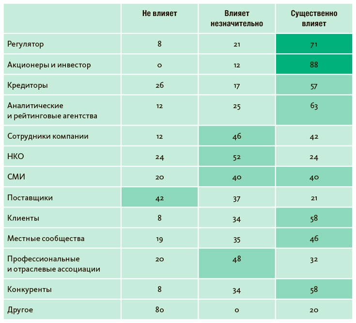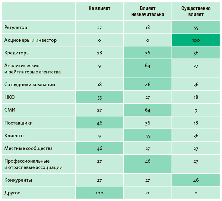 Как показывают опросы, акционеры, инвесторы и регулятор остаются главными двигателями повестки устойчивого развития российских компаний. Что и понятно: их решения обязательны для исполнительных органов. Но значимое воздействие оказывают также внешние стейкхолдеры: кредиторы, аналитические и рейтинговые агентства, клиенты и конкуренты. Именно так и работают механизмы капитализма заинтересованных сторон (табл. 4.1–4.2).