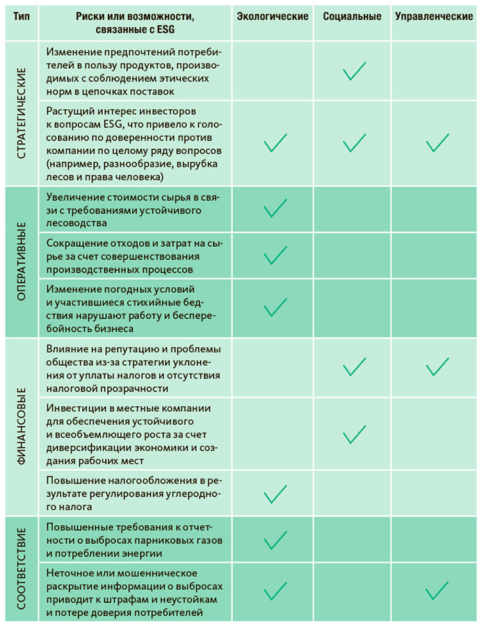 Таблица 4.3. Примеры рисков и возможностей, связанных с ESG