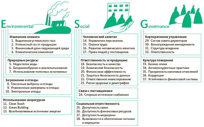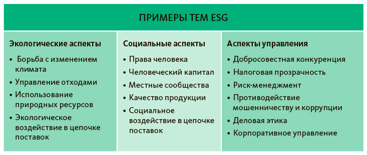 Примечание: Данный перечень не является исчерпывающим. При выборе наиболее релевантных ESG-тем следует принимать во внимание специфику страны / региона, отрасли и отдельно взятой компании.