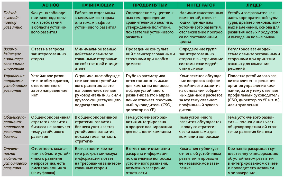 Матрица зрелости показывает, как далеко компания вышла за рамки обязательных требований в области ESG и насколько активно она распространяет эти практики.