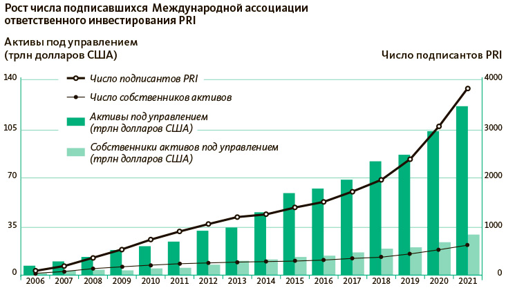 Выгодно ли бизнесу заниматься устойчивым развитием или нет, можно понять по цифрам. На конец 2021 года ответственные инвесторы управляли средствами общей стоимостью более 121,3 трлн долларов, или почти половиной мировых активов. Может ли быть так, чтобы все эти крупнейшие банки, фонды и компании занимались убыточной для себя деятельностью и вынужденно подписывали принципы PRI, причем с каждым годом их количество росло? Конечно нет: в мире не существует силы, способной заставить бизнес такого масштаба работать себе во вред, тем более вынудить рядовых инвесторов доверять свои средства заведомо убыточным фондам (рис. 4.2).
