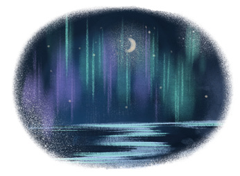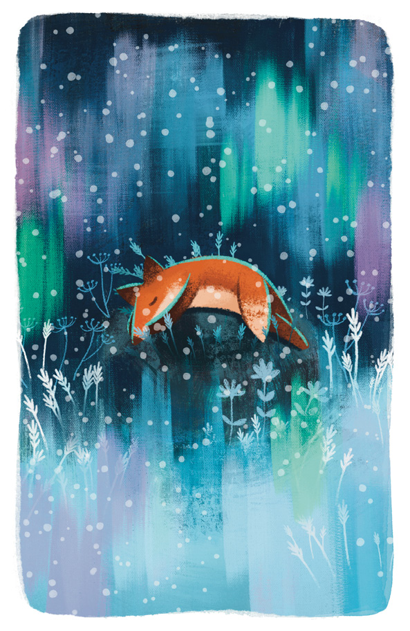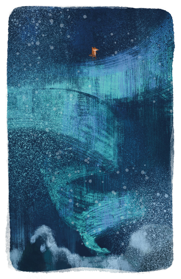 Тем временем он почувствовал, что начало холодать. На небе появилось северное сияние. Вначале бледное, оно быстро становилось ярче. Листик смотрел на эти зелёные мерцающие ленты света и любовался ими. В его родных краях сияние было редким гостем, к тому же такого яркого он не видел никогда. Здесь, на севере, оно сияло в полнеба. Мерцающие ленты начали его убаюкивать, и лис погрузился в дрёму. В какой-то момент между сном и явью ему показалось, что одна из лент сияния опускается к нему. Боясь спугнуть это чудо, Листик затаил дыхание, не шевелясь. Лента наконец опустилась перед ним, прозрачная, переливающаяся зелёным светом. Она как будто звала его куда-то. Недолго думая, лис встал и подошёл к ней. Лента замерла в ожидании. Листик осторожно потрогал её лапой. Ничего страшного вроде не произошло. Он встал на ленту всеми четырьмя лапами и прислушался к своим ощущениям. Ничего особенного, кроме лёгкого приятного покалывания в подушечках лап.