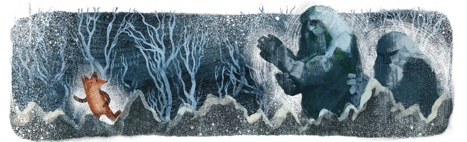 Лис размышлял о возвращении домой, как вдруг его от этого приятного занятия отвлёк мерный стук. Камень глухо и монотонно ударял о камень. Листик пытался понять, что это значит. Звук приближался, к нему добавился ещё один такой же, потом ещё один. Лис осторожно высунул голову из снега и сквозь вьюгу увидел смутные очертания надвигающихся каменных фигур. Тролли! Похоже, они всё-таки нашли его. Вспомнив, как он убегал от них накануне, Листик стал лихорадочно соображать, что ему делать. Раз тролли здесь, значит, они каким-то образом идут по его следу. Если вскочить и побежать, по такой непогоде надолго его не хватит. Троллям же пурга не помеха, снег явно не доставляет им неудобств. Значит, когда Листик выбьется из сил, тролли его догонят и… даже думать не хотелось, что могло произойти потом. Зачем он им понадобился? Неужели всё из-за того, что он прошёл через их пустошь? Оставаться в расщелине тоже смысла не было, здесь он лёгкая добыча. Положение казалось совершенно безвыходным.
