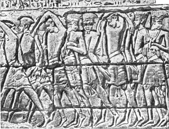 Филистимляне – военнопленные Рамсеса III (IV). Рельеф из храма Мединет-Хабу. XX династия