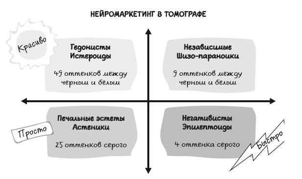 Чтобы популяризовать свои исследования среди неспециалистов, нейромаркетологи используют типологию людей по способности различать оттенки цвета: гедонисты (истероиды), печальные эстеты (астеники), независимые (шизо-параноики) и негативисты (эпилептоиды).