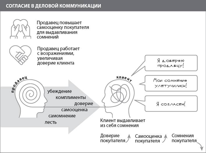 Повторим еще раз: если вам нужно отключить критическое мышление у покупателя – надо поднять его самооценку. Хвалите покупателя, а не ваш продукт. Тогда он скажет «да» вашему предложению о сделке. И только потом осознает всю тяжесть последствий своего согласия. В нашей стране трепетно относятся к данному слову. Слово не воробей, вылетит – не поймаешь! Люди в целом стараются выполнить то, что обещали. Так проявляет себя «стремление к последовательности», описанное в книгах Роберта Чалдини. Проблема в том, что выполнение данного обещания порождает мысли об ответственности.