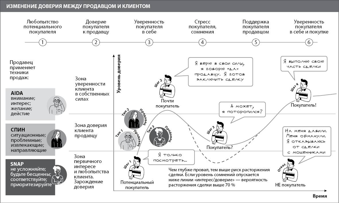 Все четыре шага изменения самочувствия и самосознания клиента вы увидели на рисунке. Данный график отражает изменение уровня уверенности в себе (для покупателя), а также его действий в соответствующий момент времени.