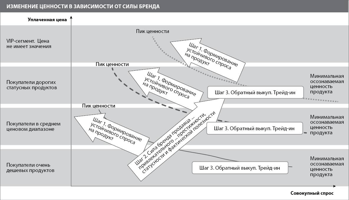 Шаг 3. Создание вторичного рынка продукта для поддержания стоимости. Все, кто организовывал продажу по безумным ценам телефонов, машин, домов, драгоценных камней, в обязательном порядке проводили мероприятия по вторичной продаже б/у изделий и поддержанию цен на такие товары. Это может быть выкуп с дисконтом, обмен на новый товар – Trade-in, залог для банка, выкуп в ломбарде и многое другое. Производитель, управляющий ценностью своего продукта, внимательно следит, чтобы цена на подержанные продукты не опускалась ниже определенного уровня, при необходимости выкупая избыток б/у изделий.