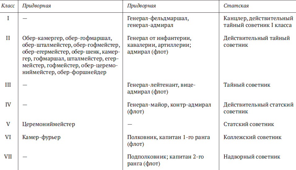 Чины I класса присваивались лишь в особых случаях именным указом государя. Чины II класса носили министры и генерал-губернаторы; III класса – товарищи министров, сенаторы; IV класса – директора департаментов, губернаторы, председатели и прокуроры судебных палат; V класса – вице-губернаторы, председатели окружных судов. Чины первых пяти классов именовались генеральскими, причем генералами называли и их статских носителей; с VI по VIII классы – штаб-офицерскими; остальные – обер-офицерскими.