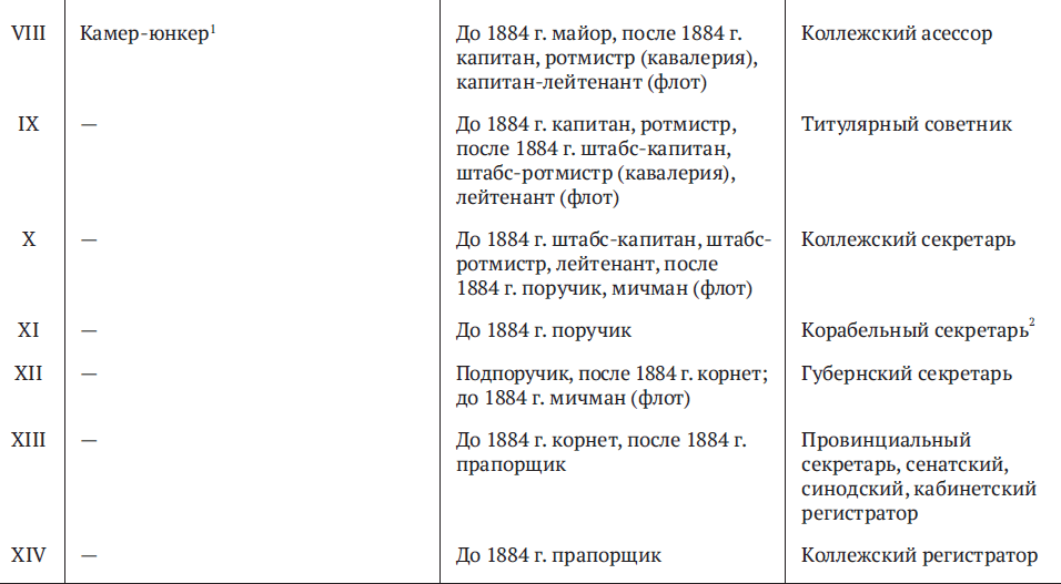 2 Гражданские чины XI класса (корабельный секретарь) и XIII класса (сенатский регистратор, синодский регистратор, кабинетский регистратор, провинциальный секретарь) числились в Табели, но не присваивались. В 1884 году они были упразднены.