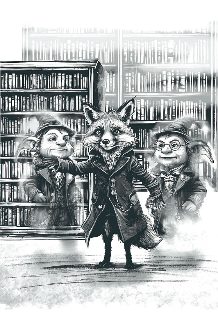 Дракон показал, и Лис, легко преодолев пятьдесят две ступеньки, попал в зал изумительной красоты. Мраморные стены и хрустальные люстры с золотой фурнитурой, персидский ковёр, удобные кресла, стеллажи с книгами в дорогих переплётах – не привыкший к такой роскоши Лис сначала растерялся. Однако уже через мгновение пришёл в себя и прыгнул к ближайшей полке. Не тут-то было! Не успел Ловкач снять книгу, как рядом в воздухе возникла фигурка лохматого и косматого существа с длинными ушами в аккуратном сюртуке, на лацкане которого красовалась витиеватая эмблема. Следом появился ещё один, похожий, а потом ещё два. «Библиотролли!» – догадался Лис.