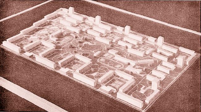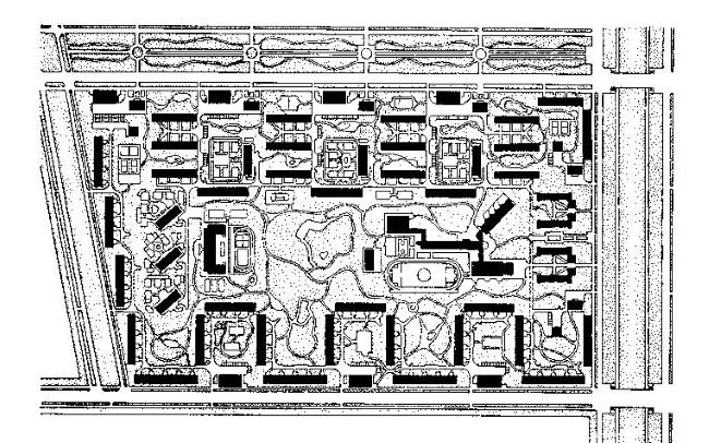 ➧Главным общим принципом становится максимальное разнообразие, а первым из путей – планировка квартала, которую авторы называют «свободной» – разумея, что она не периметральная и не строчная. На самом деле здесь собраны все ее возможные типы: и периметральная, и строчная, и линейная. При этом она все же достаточно геометрична, а дома разных серий сгруппированы, потому что строить нужно поточно-скоростным методом. Тем не менее именно 124-й квартал можно считать местом рождения свободной планировки, которая переживет в 1960-е бурный взлет. Потом, правда, разочаруются и в ней, скорбя уже «о классических традициях, о том, что “свободное” расположение зданий оборачивается неупорядоченностью, разваливает композицию, вносит хаотичность во внутриквартальные пространства»[59]59