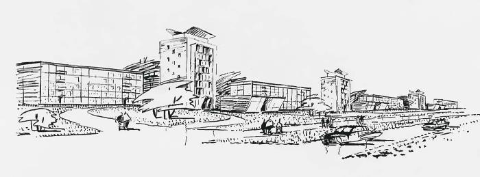[Закрыть]. Пусть не город-сад, но тоже красиво. Зелень занимает здесь 70 % общей площади, а за счет свободной планировки все это выглядит не как регулярный парк (как в Палевском), а как пейзажный. Да еще и пешеходный: все гаражи отодвинуты к проезжей части, так чтобы середина оставалась безопасной. Но самое главное, что в центре парка планировался пруд с протоками, пляжем, мостиками и беседками, – и это был бы прорыв по сравнению со всеми жилмассивами и даже 123-м кварталом, где наличествующий карьер никак не был осмыслен и переустроен.