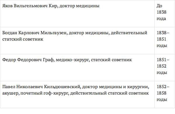 9 января 1851 года дворянское собрание избрало главным смотрителем Льва Николаевича Верещагина, генерал-майора, бывшего полицеймейстера. Должность главного доктора в то время занимал Федор Федорович Граф, а с 1852 по 1858 год – талантливый хирург Павел Николаевич Кильдюшевский.