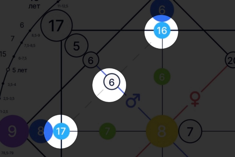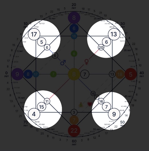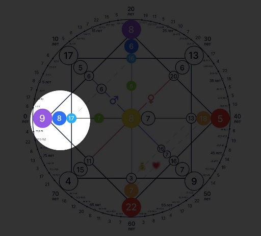 В верхних углах располагаются тройки цифр, отражающие информацию о духовных накоплениях соответствующего рода: отцовского или материнского. Эти программы принято называть Духовной кармой рода отца и Духовной кармой рода матери, соответственно. Духовная карма рода показывает, с какими вопросами нематериального плана в роду не справились – проще говоря, характеризует установки в образе мыслей.