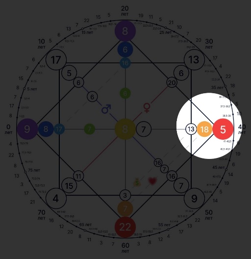 Как человек распоряжался финансами, почему не получилосьсь находиться в достатке. Цент Матрицы + Год Рождения= Пересечение Линий – 8+5=13(на рисунке прозрачный кружок), энергия между ними 5+13=18(на рисунке оранжевый цвет)