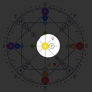 Считаем по алгоритму: Центр + Низ Матрицы = Пересечение линий – 8+22=30=3+0=3(на рисунке прозрачный кружок), затем считаем энергию между ними 22+3=25=2+5=7 (на рисунке оранжевый цвет).