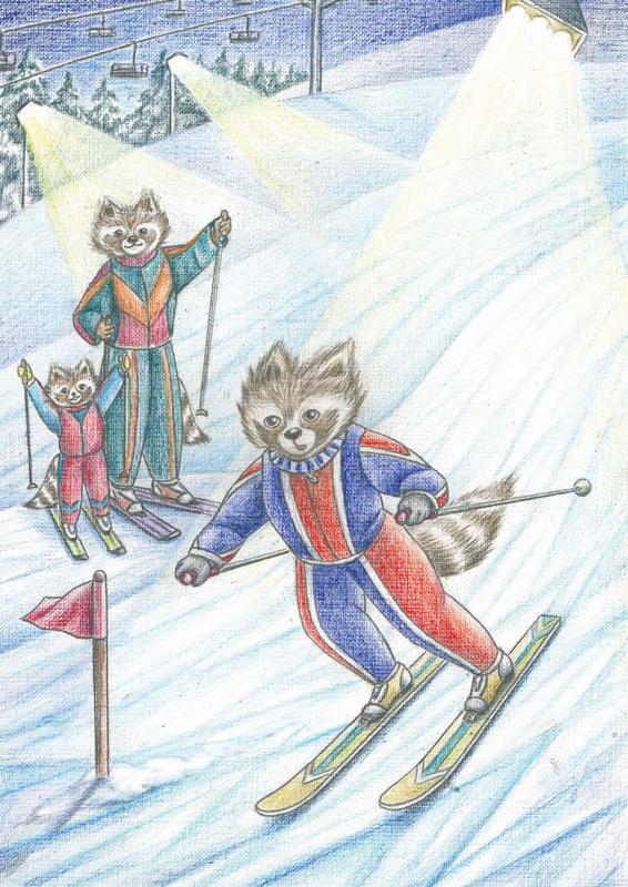 Первым съехал Миша. И сбил три флажка из пяти. Вторым – Лисёнок, который сбил два флажка. Третьим поехал Еня. Он не задел ни одного флажка. А Еля, ехавшая следом за ним, повторила успех брата.