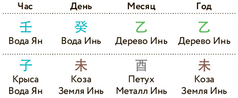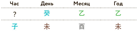 Для рассматриваемой карты используем время рождения 00:30. Соответственно, в нижнюю часть столпа часа мы поместим Земную ветвь Крысы Цзы 子, и теперь итоговая таблица столпов будет выглядеть так: