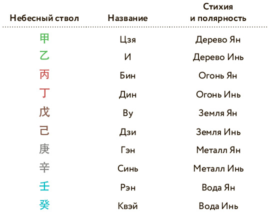 Верхний ряд иероглифов – Небесные стволы – обозначает проявленные в характере и событиях энергии в карте человека. Поскольку представлены они пятью стихиями в двух полярностях – Янской и Иньской, – мы будем оперировать всего десятью Небесными стволами. При этом в карте рождения у каждого из нас только четыре Небесных ствола, по количеству Столпов судьбы.