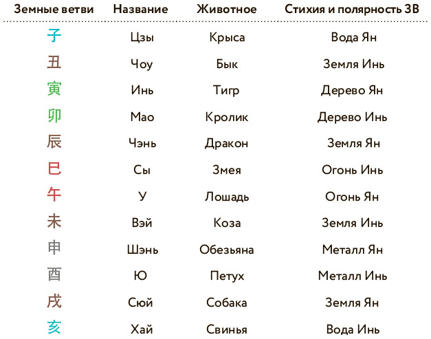 Нижний ряд иероглифов в карте – Земные ветви – соответствует двенадцати животным китайского гороскопа и обозначает базовые внутренние качества характера человека и внутреннюю предрасположенность к конкретным событиям.