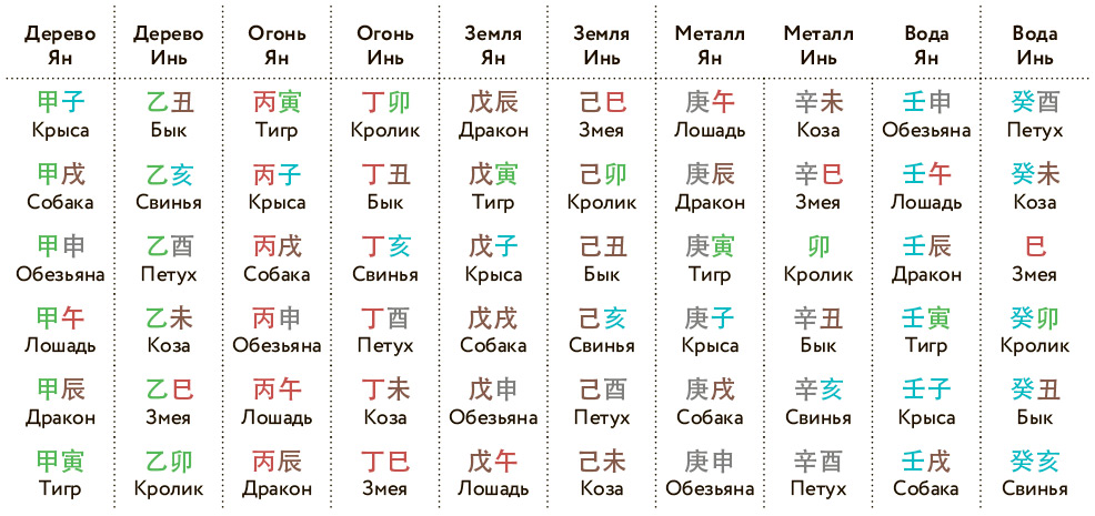 Вернемся к календарным циклам. Напомню, что время в своем бесконечном движении состоит из постоянно сменяющихся пяти стихий. Эти пять стихий в двух полярностях при взаимодействии с двенадцатью животными дадут нам 60 уникальных энергетических единиц. Таким образом, в основе китайского календаря мы увидим: 60-летний длинный цикл; 60-месячный среднесрочный, равный пяти годам; 60-дневный короткий.