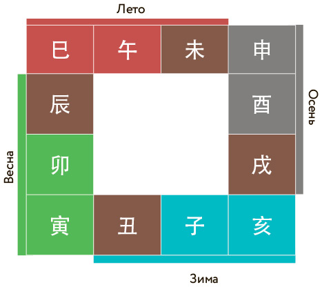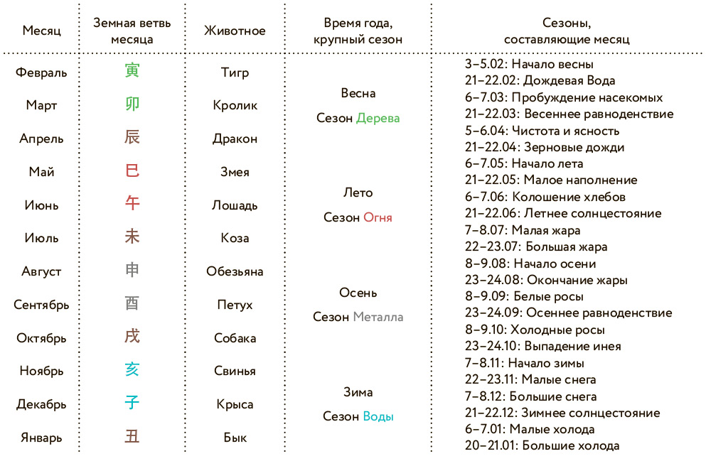 Каждый сезон включает в себя три месяца, что схоже с нашим пониманием времен года. Однако обратите внимание, что каждый из сезонов начинается как будто на месяц раньше, чем мы привыкли: так, сезон весны, когда силен элемент Дерева, начинается с месяца Тигра 寅, февраля, и включает в себя также март и апрель, месяцы Кролика 卯 и Дракона 辰.