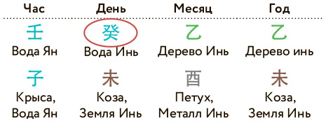 И наконец, Иньская Вода, проникая везде и стекая в глубину, увлажняет новую горсть зерен растения, за которым мы наблюдаем, дает им полив и обеспечивает силу для прорастания вновь. Именно благодаря Иньской Воде жизнь снова начнется, спящие корни обязательно дадут новые ростки. Иньская Вода в Небесном стволе дня показывает на человека знающего, с тонкой интуицией, способного работать вне видимости, «в тылу», но каким-то чудесным образом проникающего во все процессы.