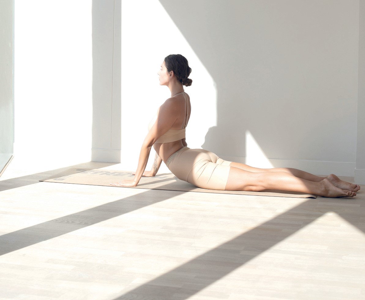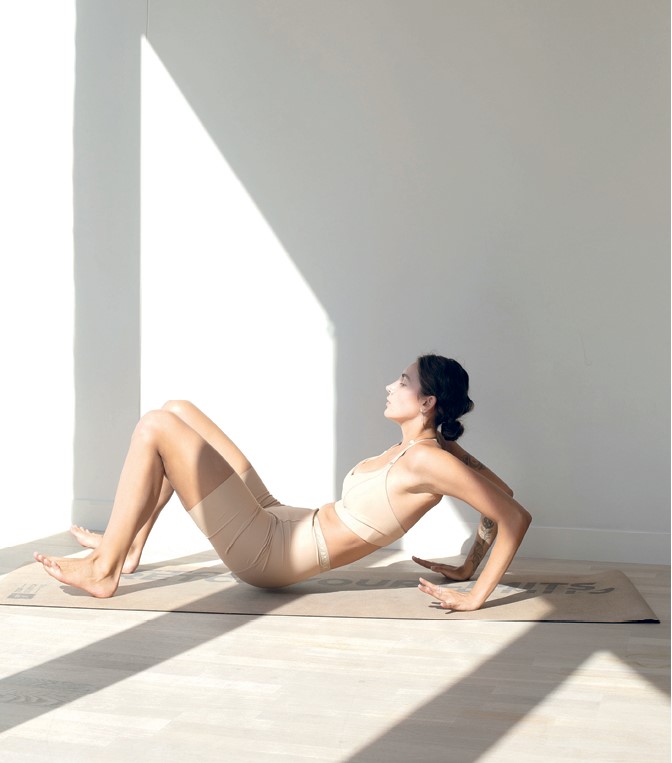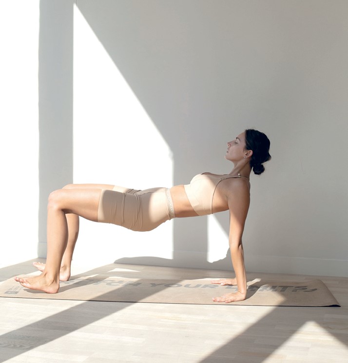 • На выдохе выталкиваем таз кверху, встаем в обратную планку на прямых руках и согнутых ногах.