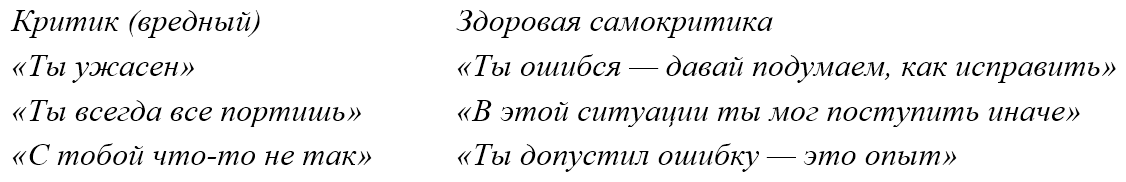 Как отличить внутреннего критика от здоровой саморефлексии? Это нетрудно. В одних тех же ситуациях они дадут вашим действиям разные оценки. Внутренний критик – со знаком минус. Здоровая самокритика – положительные, с надеждой на изменения к лучшему.
