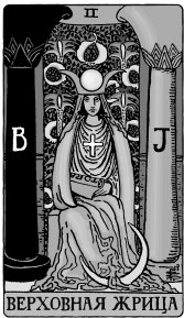 У входа в мистический храм восседает дева со свитком на коленях. Ее одежды струятся потоками воды и будто излучают внутренний мерцающий свет. Это свет Солнца, отраженный Луной, свет всего сущего, который мы можем познать благодаря энергии Верховной жрицы. Маг связан с активностью и выплеском энергии вовне, Жрица – с пассивностью, следованием, восприятием и поглощением. Поэтому она обращена внутрь себя и олицетворяет те смысл и идеи, которые скрываются за всякой формой. Являя собой тень от источника света, Верховная жрица порождает двойственность, недосказанность и тайну.