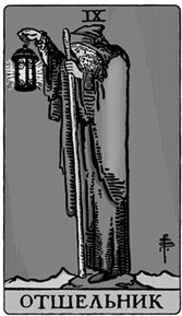 Высокий убеленный сединами старец с посохом в одной руке и светильником в другой стоит посреди обледенелых гор. Потрепанное монашеское одеяние говорит о том, что он прошел большой путь, прежде чем добрался туда, где он пребывает. У Отшельника есть цель, и он неуклонно к ней стремится, становясь светочем для таких же ищущих, как и он сам. Отшельник – тот, кто развивается вглубь, уходит от толпы, чтобы найти человека, прежде всего внутри самого себя.