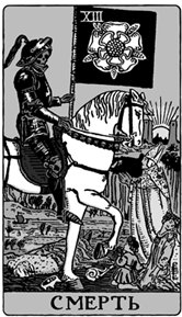 Перед нами сцена апокалиптического видения, которая предвещает последующий переход в лучший из миров – Небесный Иерусалим, очертания которого проявлены на горизонте между башен. В руках мрачного жнеца мы не видим никакого оружия, наоборот, он держит флаг с мистической розой жизни, а на горизонте сияет солнце бессмертия. Смерть означает важные изменения в жизни человека, на которые сложно повлиять. Это открытие нового пути, движение вперед и расставание со своим прошлым через кризисный этап. Девиз аркана – «Умри и возродись», ведь недаром он предваряет вход в шестую сефиру Тиферет на Древе, связанную с возрождением в новом качестве. Под смертью здесь понимается сбрасывание отживших форм, старых оболочек, которые выполнили свою функцию, но теперь мешают двигаться дальше. Естественно, такие процессы сопровождаются кризисом и завершением существующей ситуации.