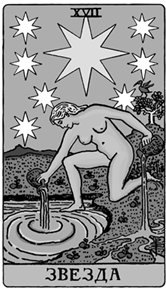 Обнаженная дева выливает из двух кувшинов воду в озеро и на землю, над ней сияет большая восьмилучевая звезда в окружении семи звезд поменьше. Сама дева вписана в них так, что представляет собой восьмую звезду, и вместе они образуют законченный узор мироздания. После раскаленной атмосферы Башни мы попадаем в пространство прохлады, спокойствия и свободы, над которым светит путеводная звезда. Аркан символизирует возрождение, обновление, вдохновение и надежды на будущее.