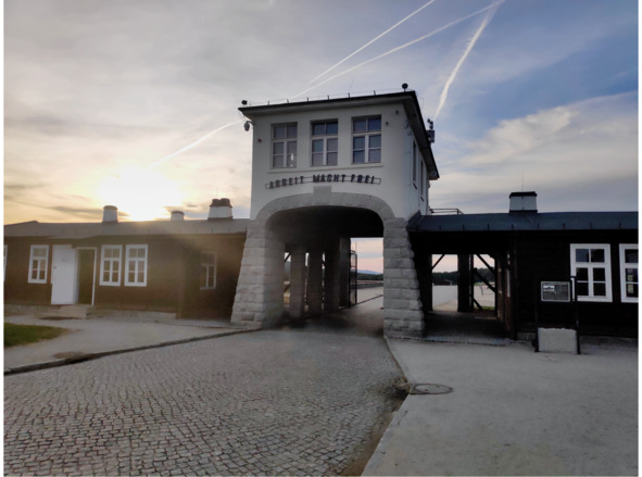 Ворота лагеря Гросс-Розен. На них та же надпись, что и на воротах Аушвица «Труд освобождает»