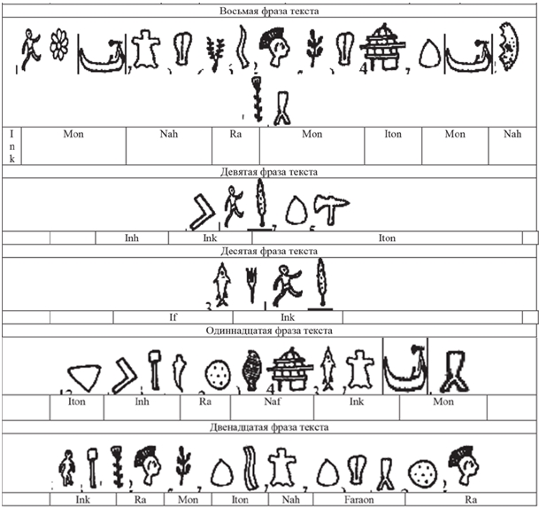 Применяя этот метод, попробуем подставить фонетику (или фонетическую матрицу) древнеегипетских «Гимнов Атона» в тексты Фестского диска. Если мы получим их полное слияние – фонетики египетских «Гимнов Атона» и лексики Фестского диска, тогда можно будет считать, что тексты Фестского диска представляют собой копии древнеегипетского храмового текста «Гимны Атона» (в «Гимнах Атона» – два текста, так же как и на Фестском диске), только выполненными другими видами иероглифики, что позволит считать идентификацию Фестского диска успешно проведённой.